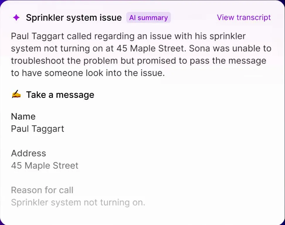 Sona our AI agent greets callers answers questions and captures messages at a fraction of the coast